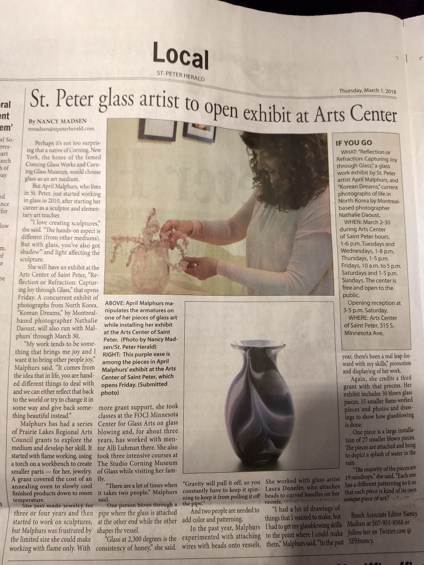 I am excited to greet people at my exhibit at the Arts Center of St Peter. I love how work looks in the gallery. The natural lighting and spot lights make the glass shimmer, the shelves are perfect for my smaller pieces and my work fills the space while leaving room to view the work from all sides. My large installation is beautifully lit and the shadows give an illusion of more raindrops. The above article was a preview of the show and I hope it brings more folks in to see it. One minor correction, I great up near not in Corning, NY.