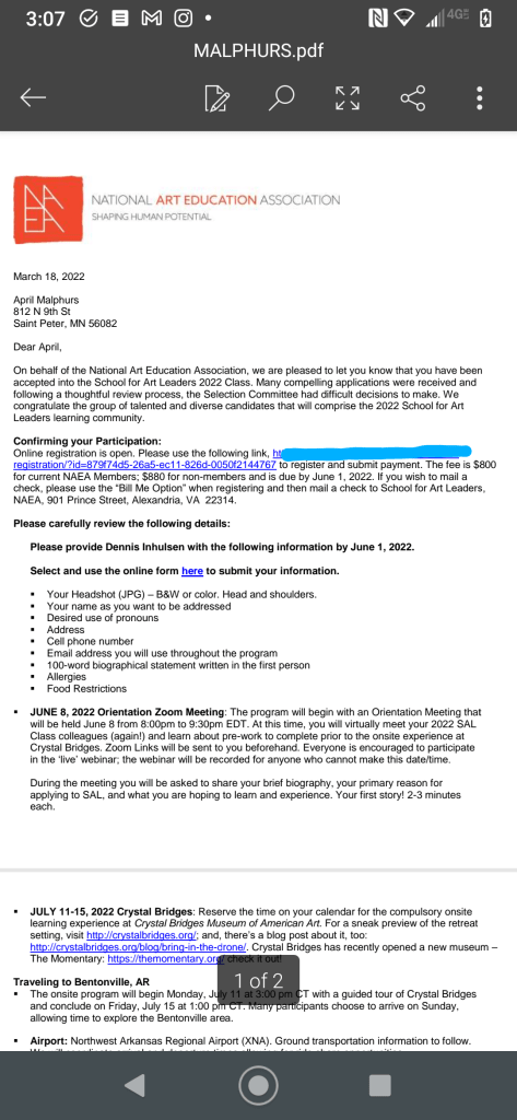Last week I received this letter announcing I had been accepted into the 2022 class at the NAEA School for Art Leaders. I am honored and absolutely thrilled for this opportunity to explore leadership with other art educators and the chance to develop myself. This comes at the perfect time in my life as I have been wanting the chance to think about what my priorities are and the directions I want to go as an artist and educator.