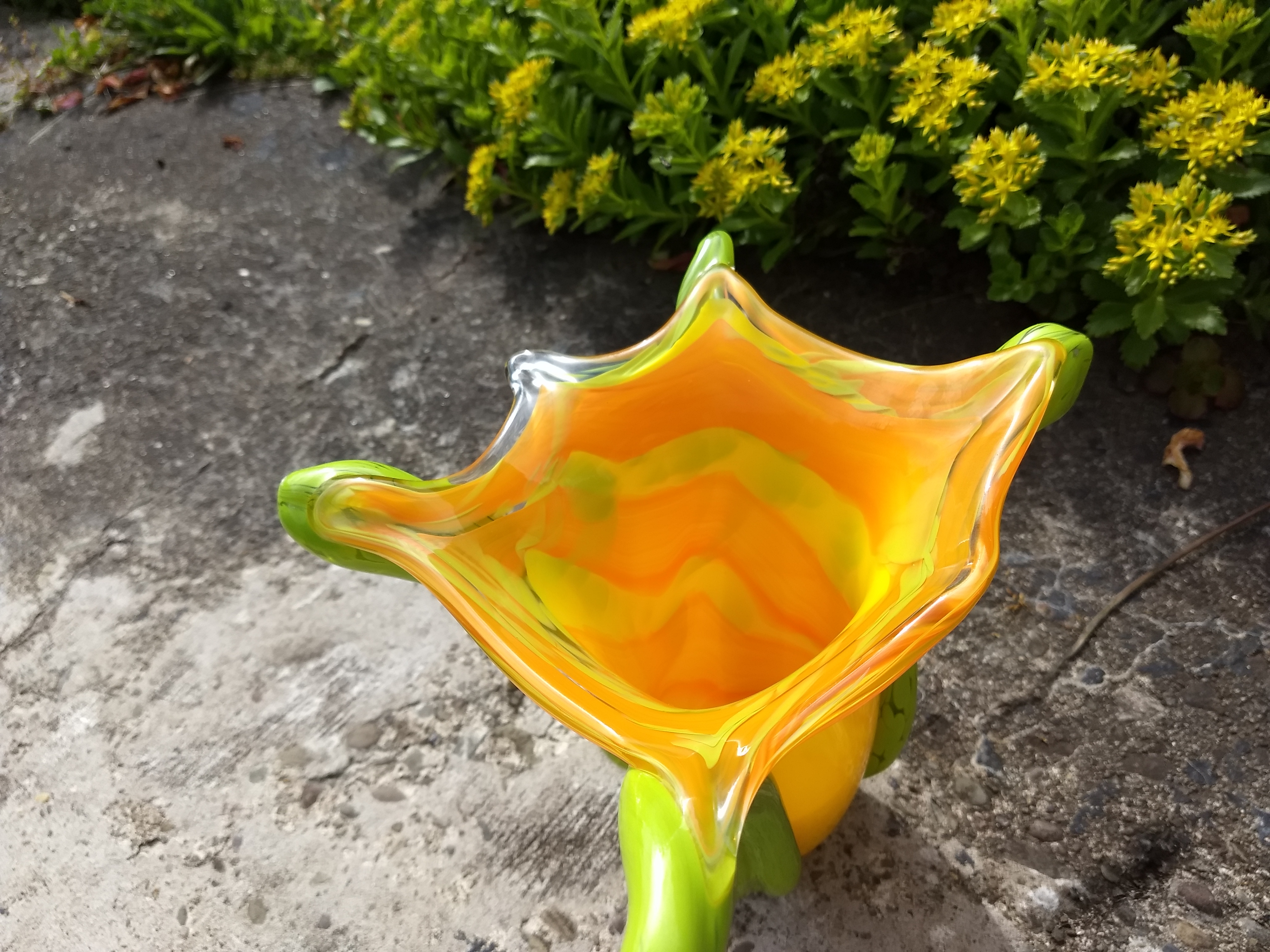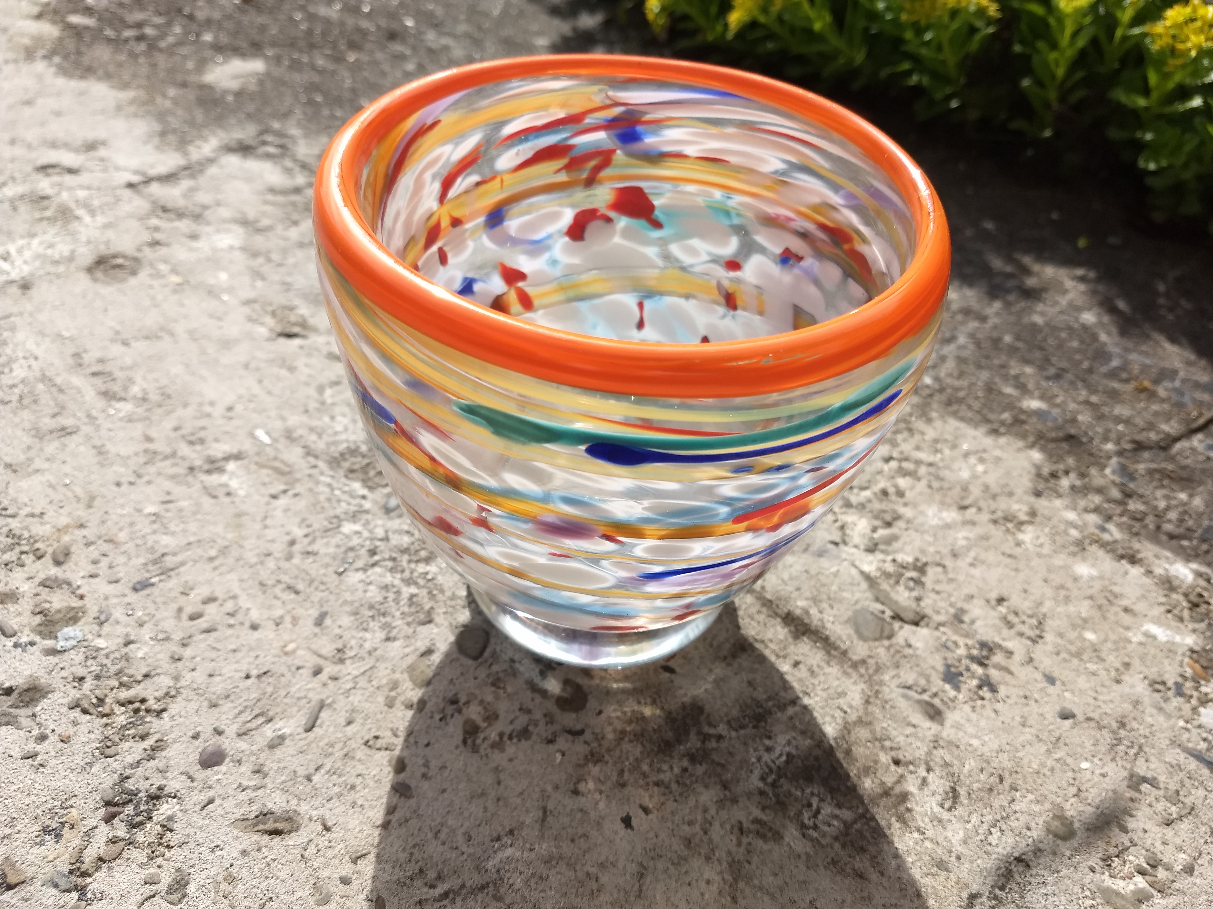 Guacamole bowl – expect to see this at our deck parties! I used a lot of layers of different ways of adding color…white frit, a spiral this wrap of orange, and a pick up of various colors of stringers. And topped off with an orange lip wrap.