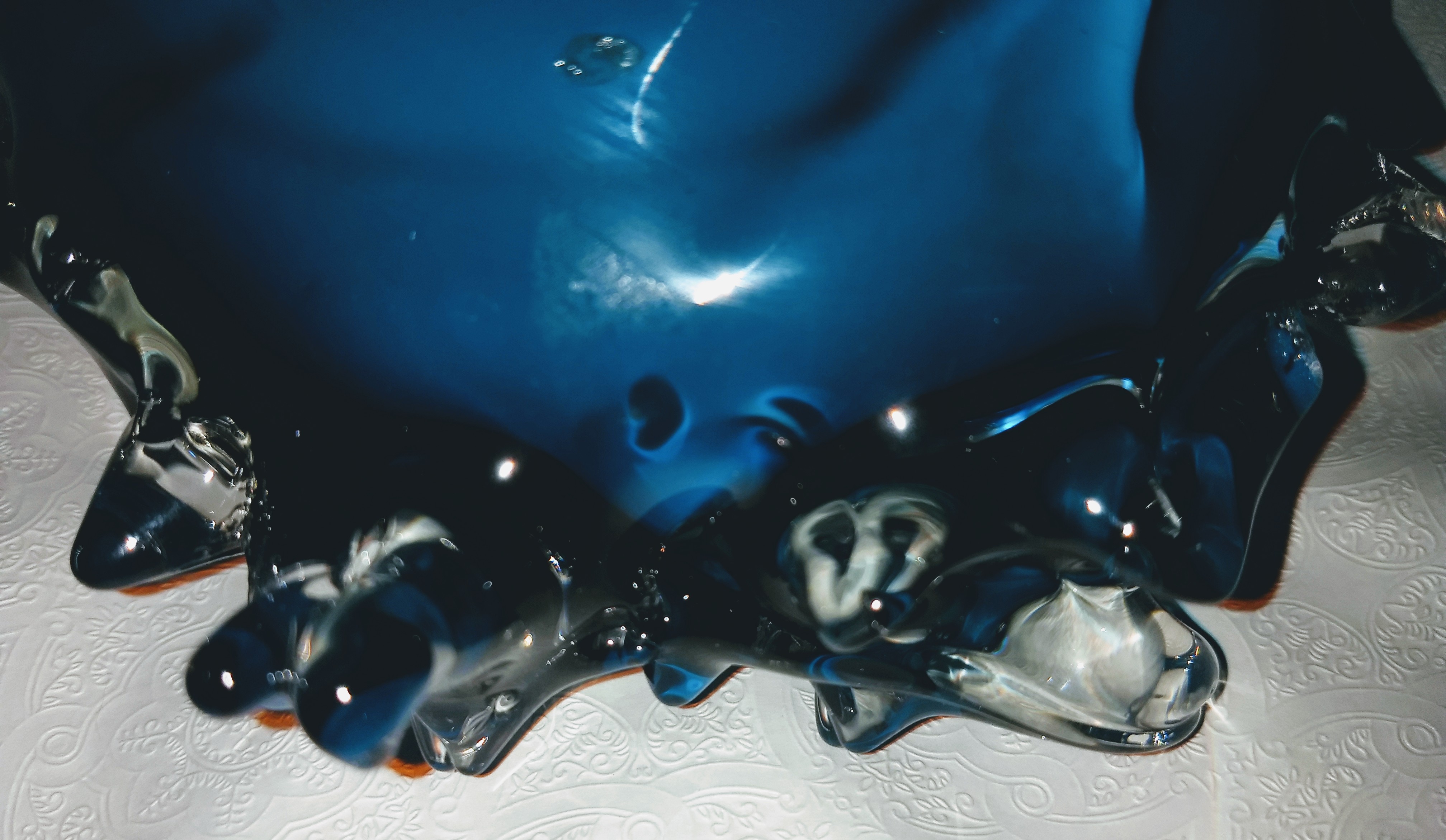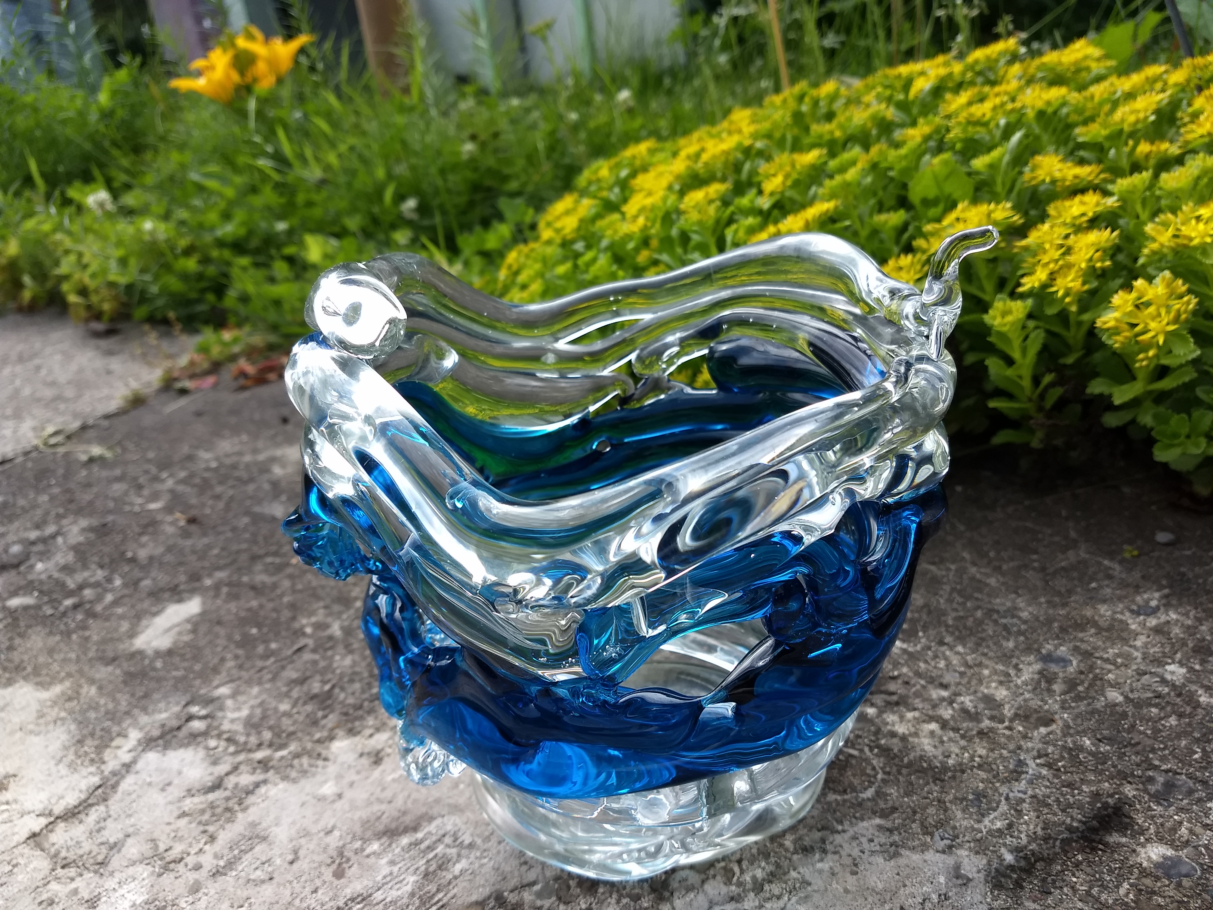 Hand built. I love the look of hand building in glass as well as the experience itself…it is like making a coil clay pot but at 2300 degrees. I tried a small version of this two years ago with Laura, but this time I wanted to push it further. I went bigger and tried a layer of blue with the clear. This is a soft blue so it was a challenge, so next time I will pick a stiffer color to add to the clear. Again I appreciate how much my knowledge of color expanded and the clearer understanding of it I have from these explorations. I love the smaller holes and how they add to it with an almost woven feel. It was cool to experiment with the temperature of the coils and what I prefer for shaping them too. This is something I definitely want to do more of too!