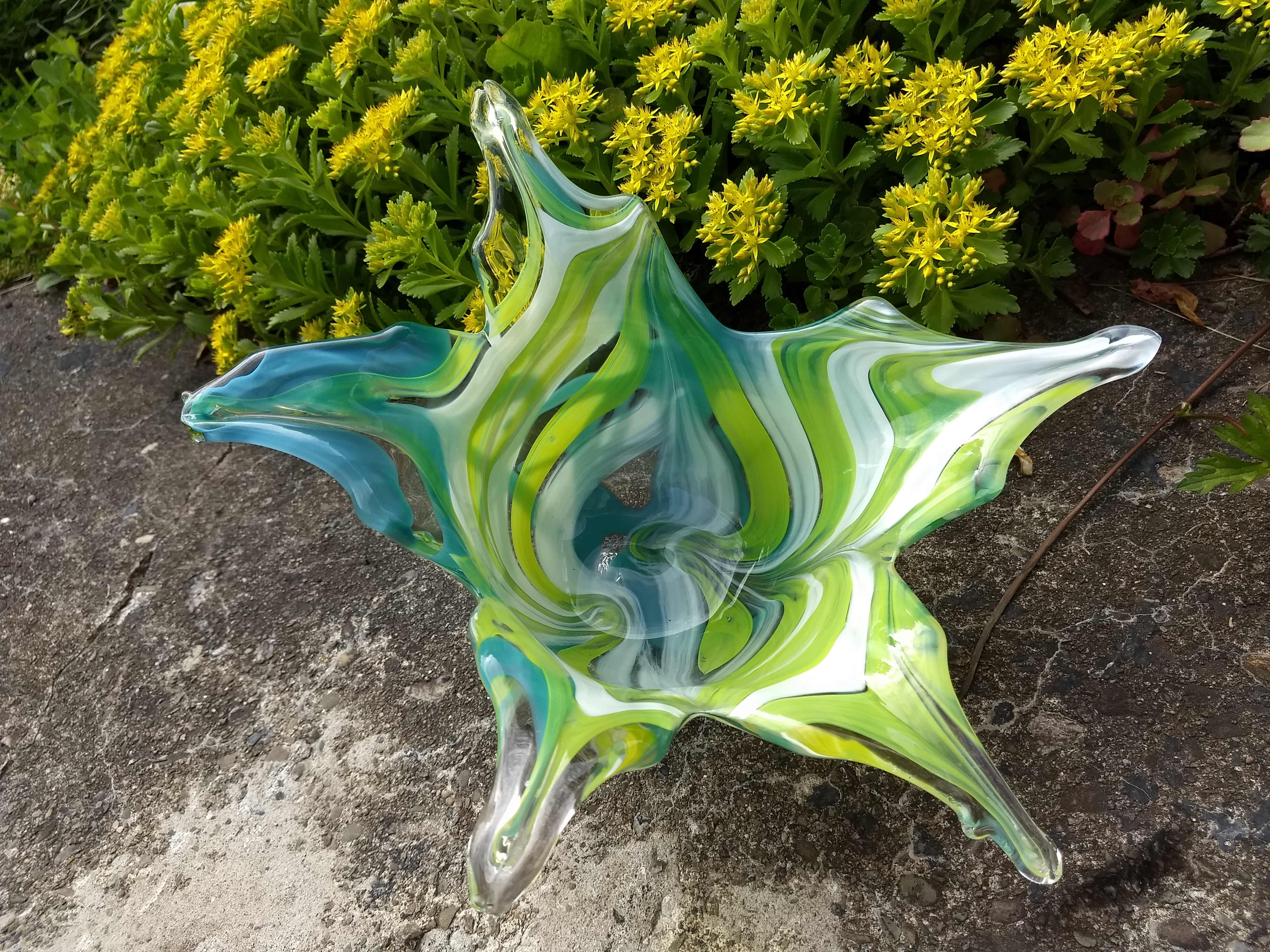 As an art teacher, it was fun to play with mixing colors in a whole new way….I really grasped the concepts of keeping colors separate with clear layers between and mixing colors by placing them directly on top of each other. The glass on the right is the color straight out of the furnace. The one on the left is Amber with the blue on the right over it to make green. This was mixed specially for my Grandmother who loves green and who I stayed with during my class. Also check out my last piece at the bottom with an opaque turquoise under this same transparent blue.