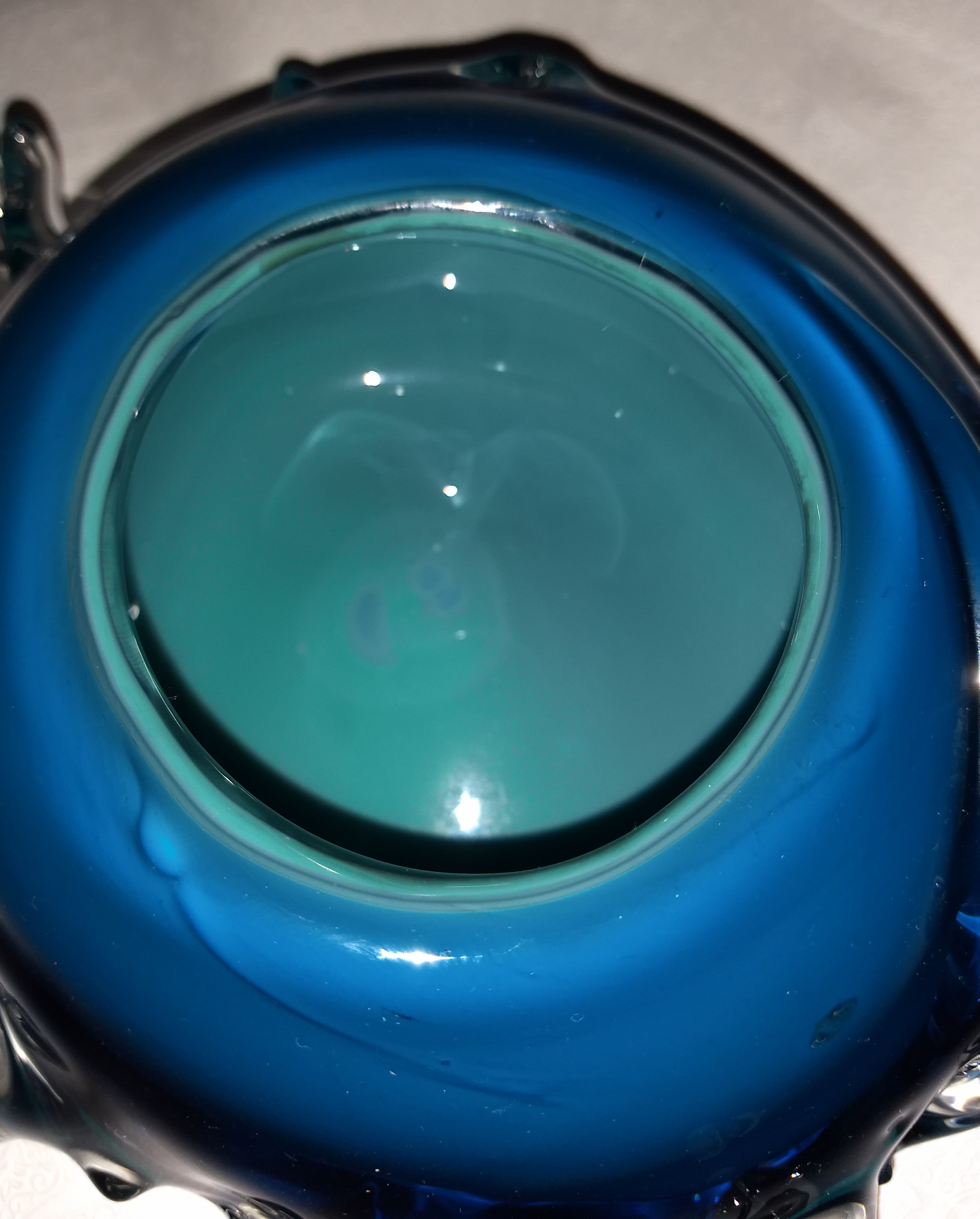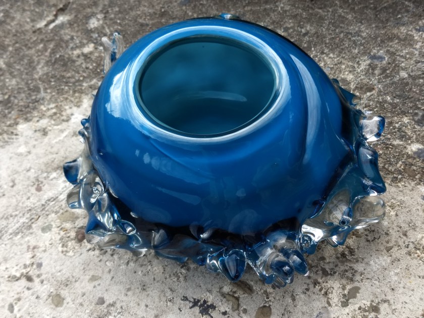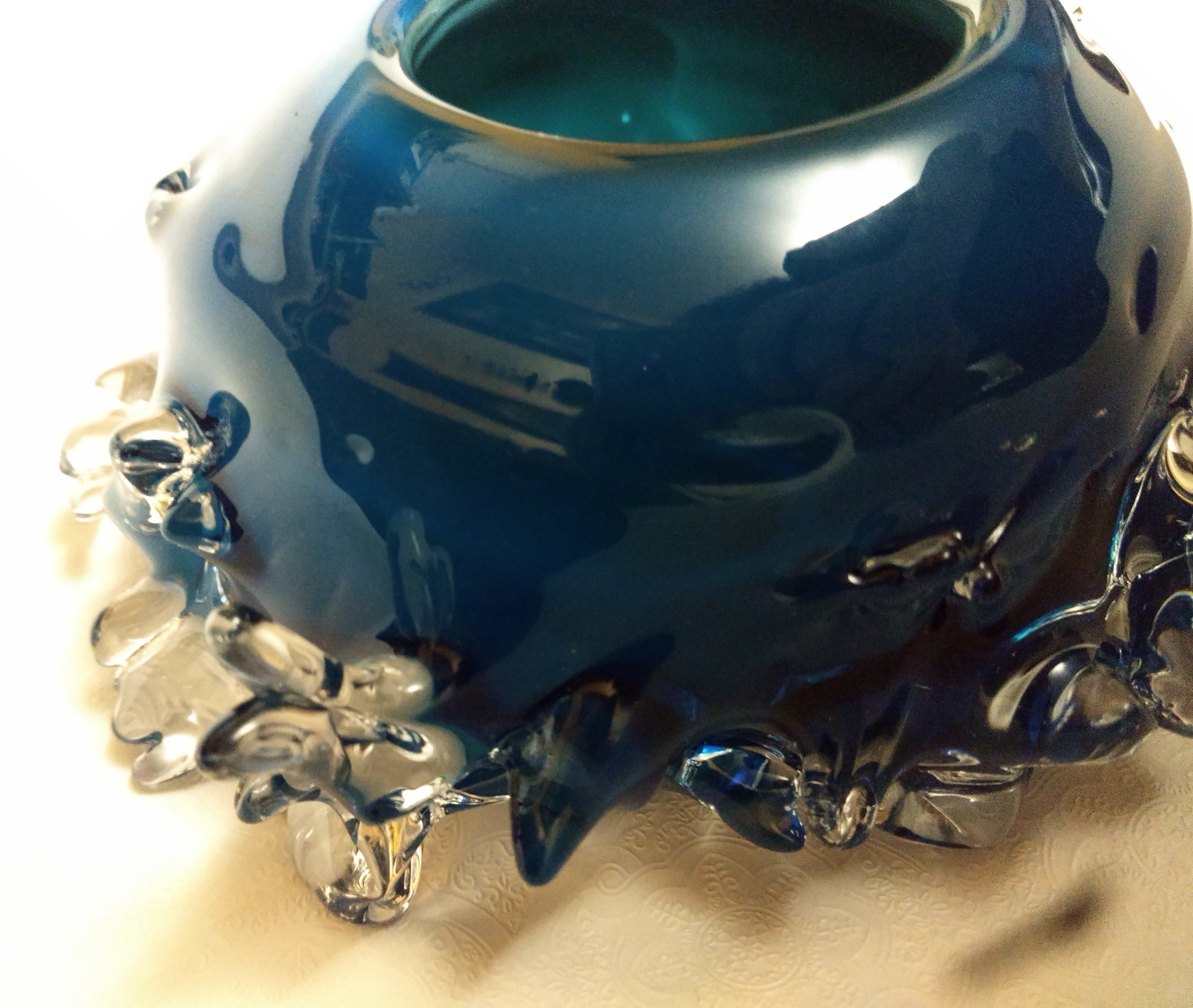 Cutting into hot glass…it was harder than it looked and I want to keep trying it more. I was glad I was wearing gloves too. Here I worked with layering colors and contrasting textures…the smooth sleek bowl with the sharp, jagged cut glass. Several people asked for some detail photos of this piece. You can see the interior turquoise with the blue layered over to create a new blue as well as the cut glass up close.