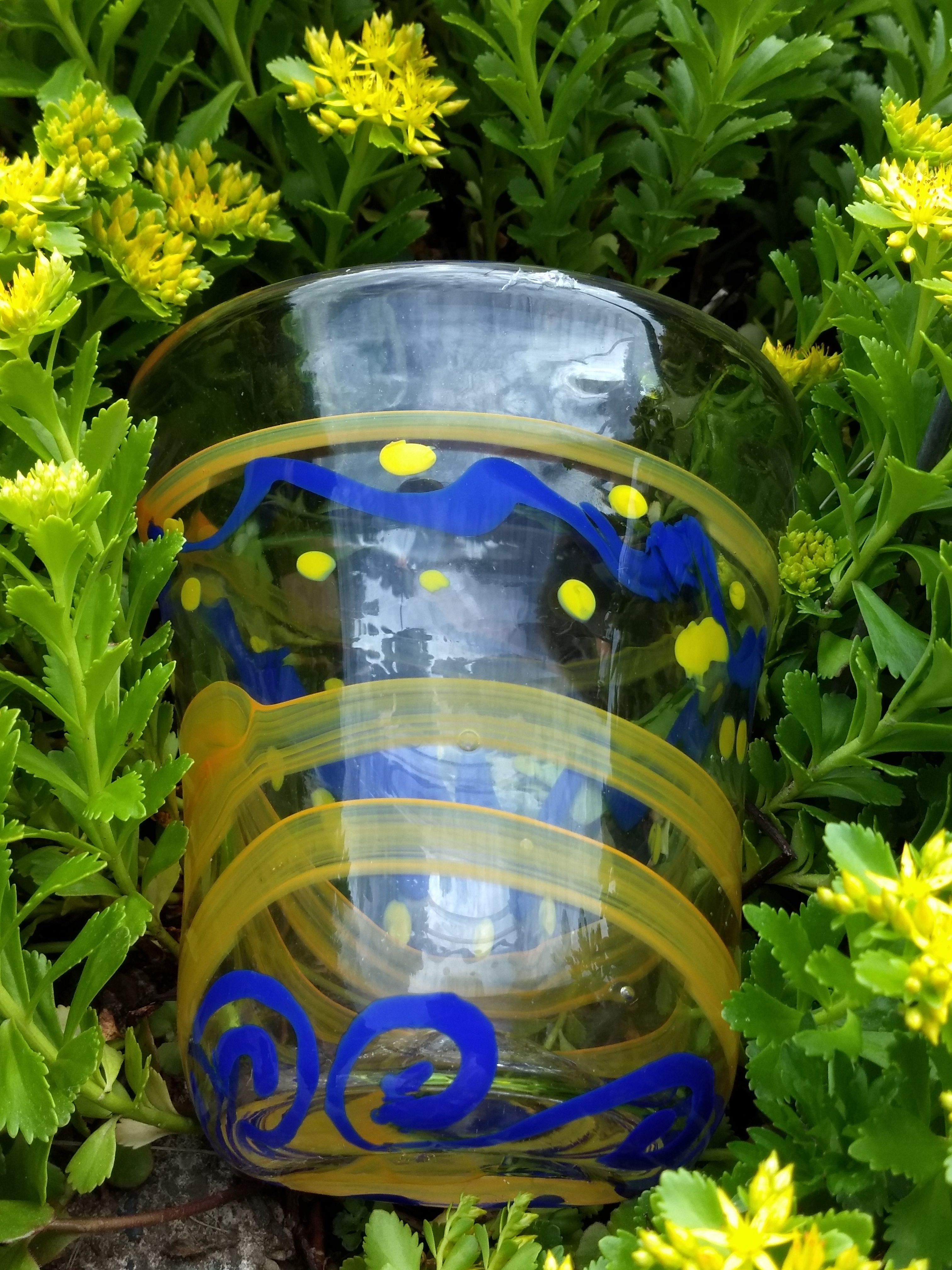 I was working on cutting into the hot glass at the lip of the vessel and pulling it into pointed leaf like shapes. I also was playing with contrasting the organized geometry of the feathered patterning on the interior with the loose drizzle freeform design over it on the exterior. (Top photo). I look forward to playing with this contrast more in my pieces.