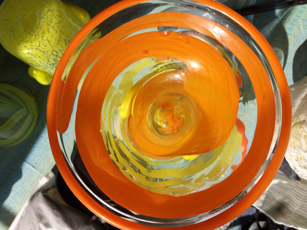 I have the bees’ approval! My recent work has focused on the symbiotic relationship between humans and bees. Inspired by a bee that kept photo bombing (above left) when I was taking pictures of my piece, Botanical Fantasies, I began researching bees and hives. I have always been amazed at the architectural beauty and stability of bee hives. I have enjoyed exploring a variety of methods of using glass to create bee hives, honey drippers, honey pots and vases to remind us of the importance of these small creatures to our own lives. We need to take care of them, because they help feed us. Our lives depend on them and their lives depend on us!