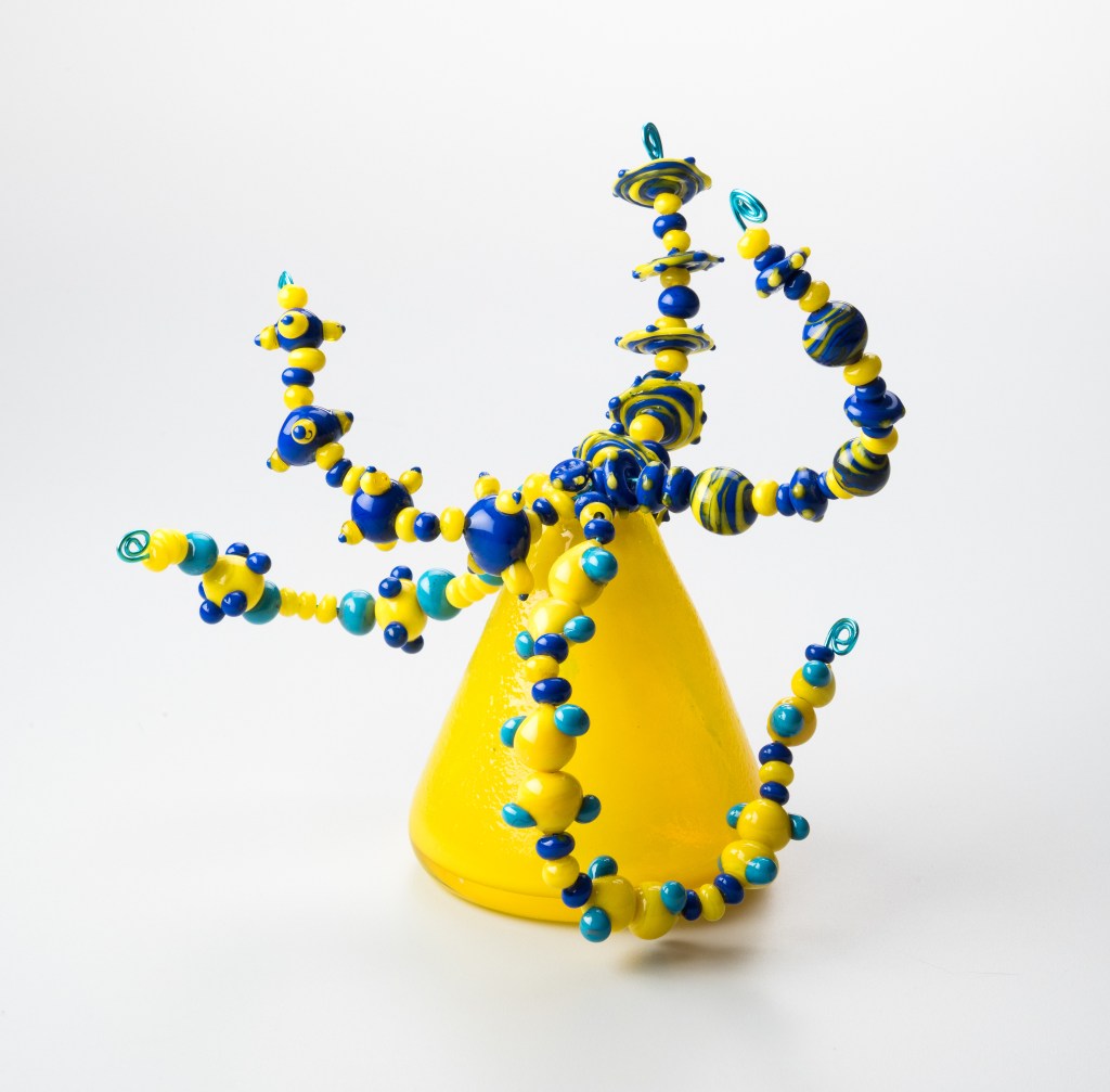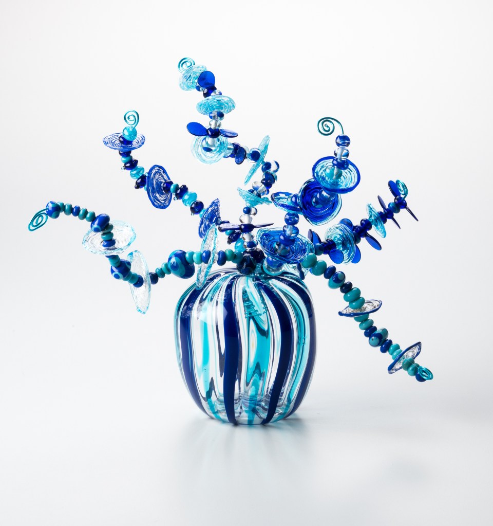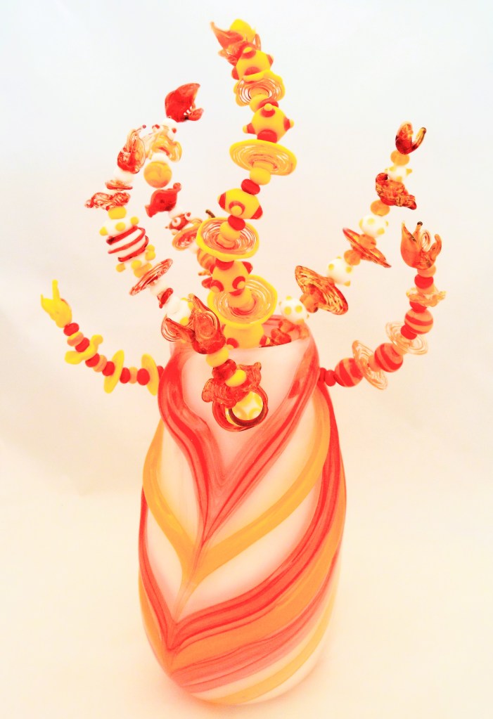 Much of my work is non-representational with inspiration coming from the forms, colors or patterns of the beads or blown bases. Once the initial idea occurs to me, I work to create a feeling of harmony between the beads and base. I want the average person to look at and respond to the colors, patterns and shapes. For those pieces that are representational in nature, I want the concept to be recognized with ease and to elicit the audiences own memories or experiences in reaction to the work of art.