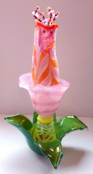Botanical fantasies, my newest series of sculptures, captures the warmth and joy of summer year round. This past winter, following a number of below zero days, I began searching for images of tropical flowers as an escape from the dull colors and cold. The variety of shapes and colors inspired me to create fanciful flowers out of glass. Botanical fantasies are flowers completely out of this world, taking us into an imaginary place full of giant flowers and full of color and joy. Additionally a glass bees’ nest will hang on a branch extending out from the wall. The pieces will all work together to create a feeling of a wondrous garden that opens our imagination and takes us back to our childhood. This piece also focuses specifically on symbiotic relationships…ours with the bees, the bees with the flowers and ours with the flowers…we all need one another for survival. Surrounding ourselves with things that elicit joy is important for our mental health. In a rushed, hectic world, adding joy in our environment can help us maintain a balance. Through my work, I want to inspire others to find that momentary relief in joy or that longer lasting peace and calmness that I find in creating it. In life and in my work, one can reflect the difficulties we face letting it determine our path or like light refracting through glass, we can change the direction and give back something beautiful.
