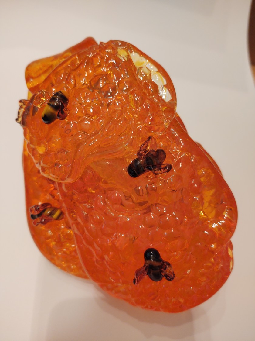 I have the bees’ approval! My recent work has focused on the symbiotic relationship between humans and bees. Inspired by a bee that kept photo bombing (above left) when I was taking pictures of my piece, Botanical Fantasies, I began researching bees and hives. I have always been amazed at the architectural beauty and stability of bee hives. I have enjoyed exploring a variety of methods of using glass to create bee hives, honey drippers, honey pots and vases to remind us of the importance of these small creatures to our own lives. We need to take care of them, because they help feed us. Our lives depend on them and their lives depend on us!