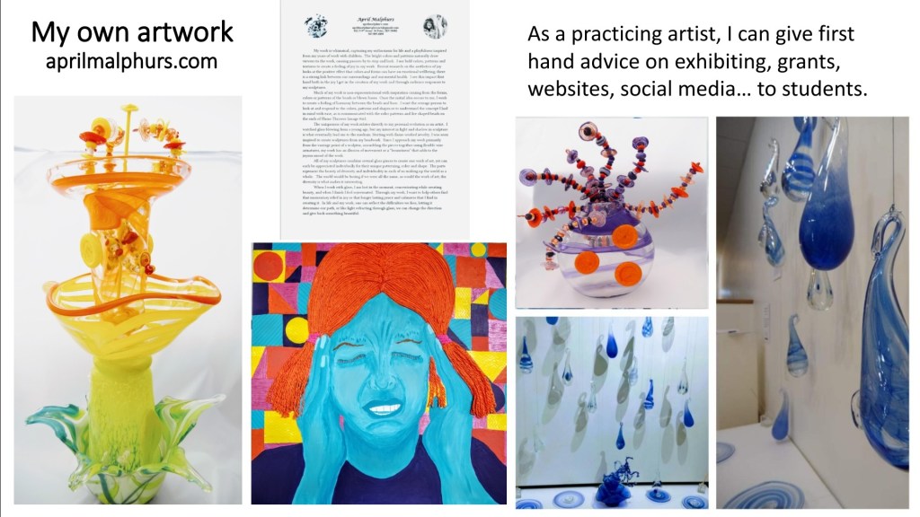 Lastly, through sharing and discussions, I aim to develop students’ communication and analytical skills by developing their ability to back up their opinions with specifics and explanations of why they believe or see that in the work. Additionally, by having students focus on the how and why behind their decisions, students’ self-esteem and confidence increase as they develop a growth mindset focusing on the effort and work they put into their art.